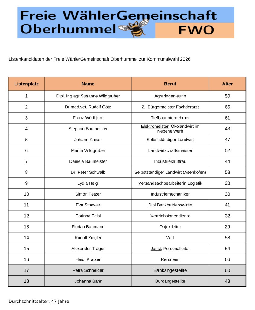 Oberhummel. Zur Aufstellungsversammlung für die Kommunalwahl 2026 am Mittwoch, den 03.12.2025 konnte die Vorstandschaft der Freien Wählergemeinschaft Oberhummel (FWO), um Susanne Wildgruber neben nahezu allen 16 Listenkandidaten und zwei Ersatzkandidaten eine reiche Zuhörerschaft begrüßen. Somit waren fast alle Plätze im Gasthaus Neumair in Oberhummel besetzt.