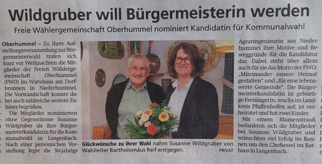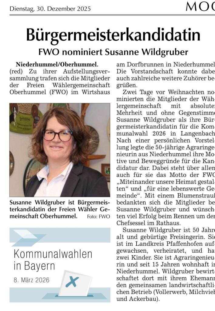 Zeitungsbericht Moosburger Zeitung vom 30.12.2025 zur Aufstellungsversammlung zur Bürgermeisterwahl