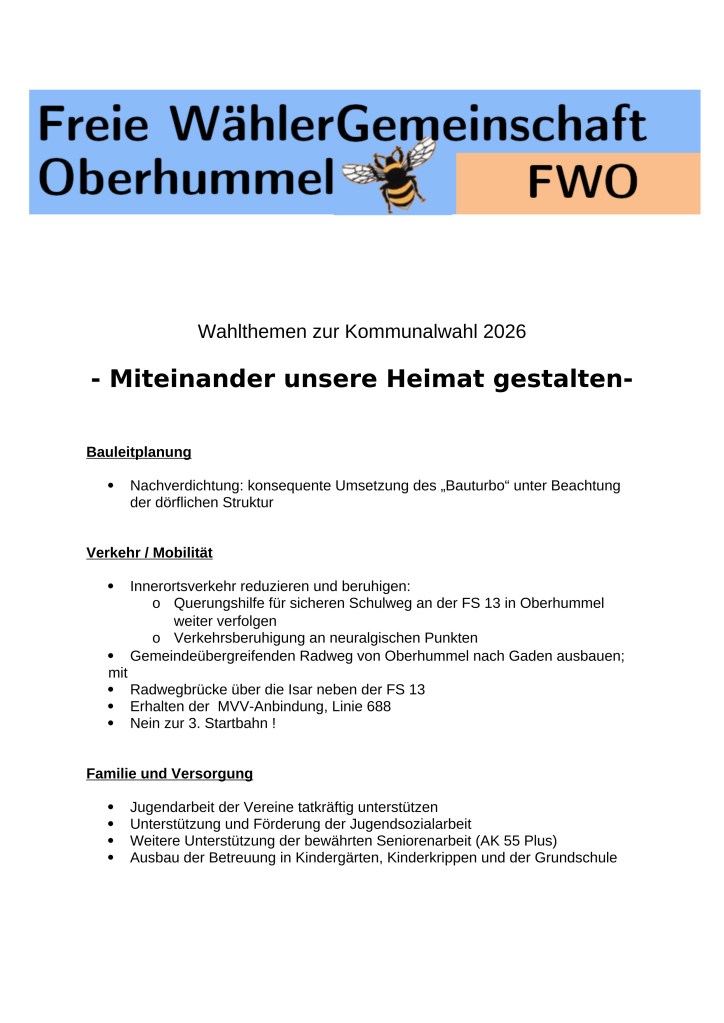 Über allem steht das Motto der FWO „Miteinander unsere Heimat gestalten“.