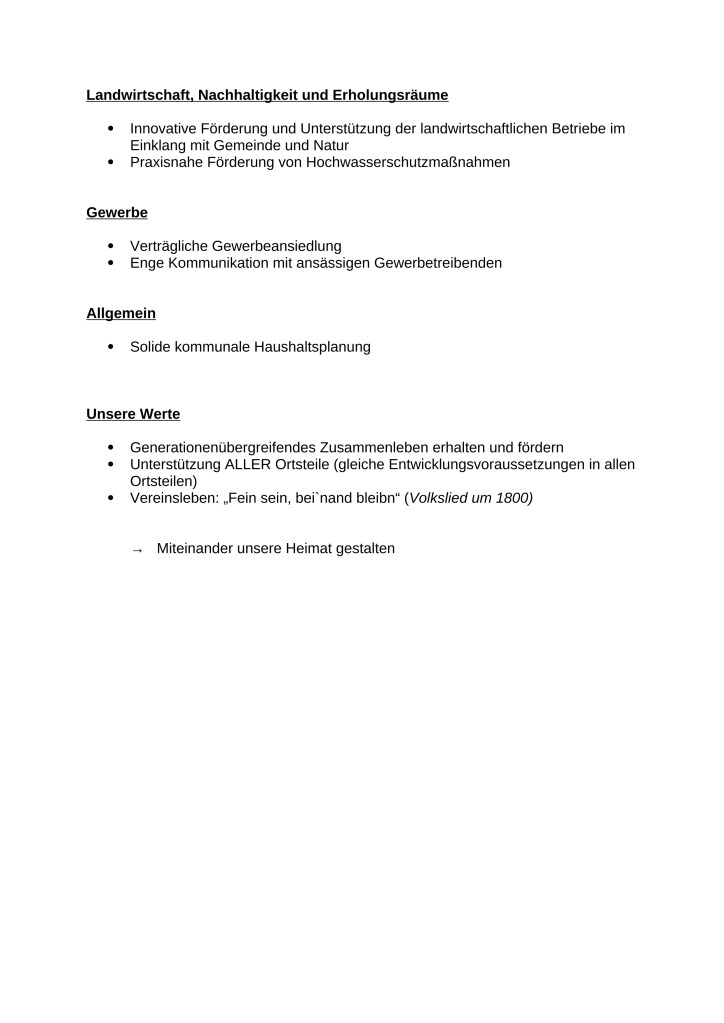 Dazu gehört zu den wesentlichen Zielen die konsequente Umsetzung des sogenannten „Bauturbos“ zur Schaffung von Wohnraum besonders für Einheimische und junge Familien. Ebenso die weitere Unterstützung der hervorragenden Jugendarbeit, sowohl in den Vereinen, als auch durch die Gemeinde und durch die Jugendsozialarbeit. Die Verkehrsberuhigung innerorts sowie die Realisierung der jahrelang aufgeschobenen Querungshilfe an der FS13 werden ebenfalls priorisiert. Weitere Schwerpunkte sind die Landwirtschaft, der Hochwasserschutz und das ansässige Gewerbe, sowie die Gleichstellung aller Ortsteile. Die Basis für das Erreichen dieser Ziele ist dabei eine solide kommunale Haushaltspolitik.